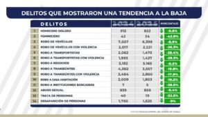 Entre los delitos que mostraron reducciones están el homicidio, con una baja del 9.8 %, así como el robo de vehículos en 8.9 %, el robo a transportistas con una disminución de 28.4 %, y el robo a transeúnte con 18.8 % menos casos; también se observó una caída en el robo a casa habitación (10.2 %) y el robo a instituciones bancarias (28.5 %), entre otros delitos del fuero común.